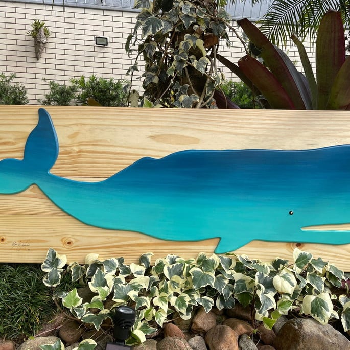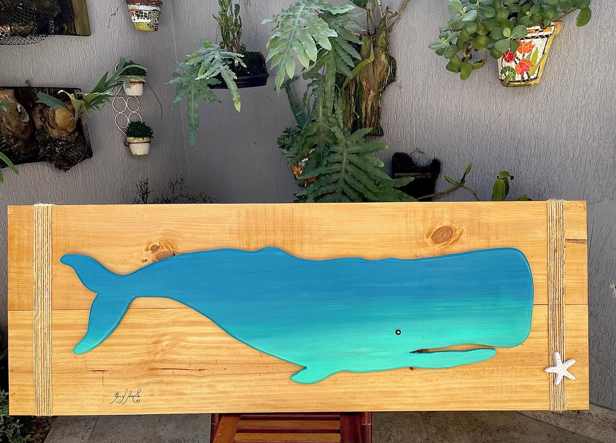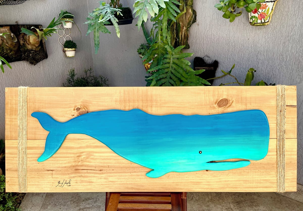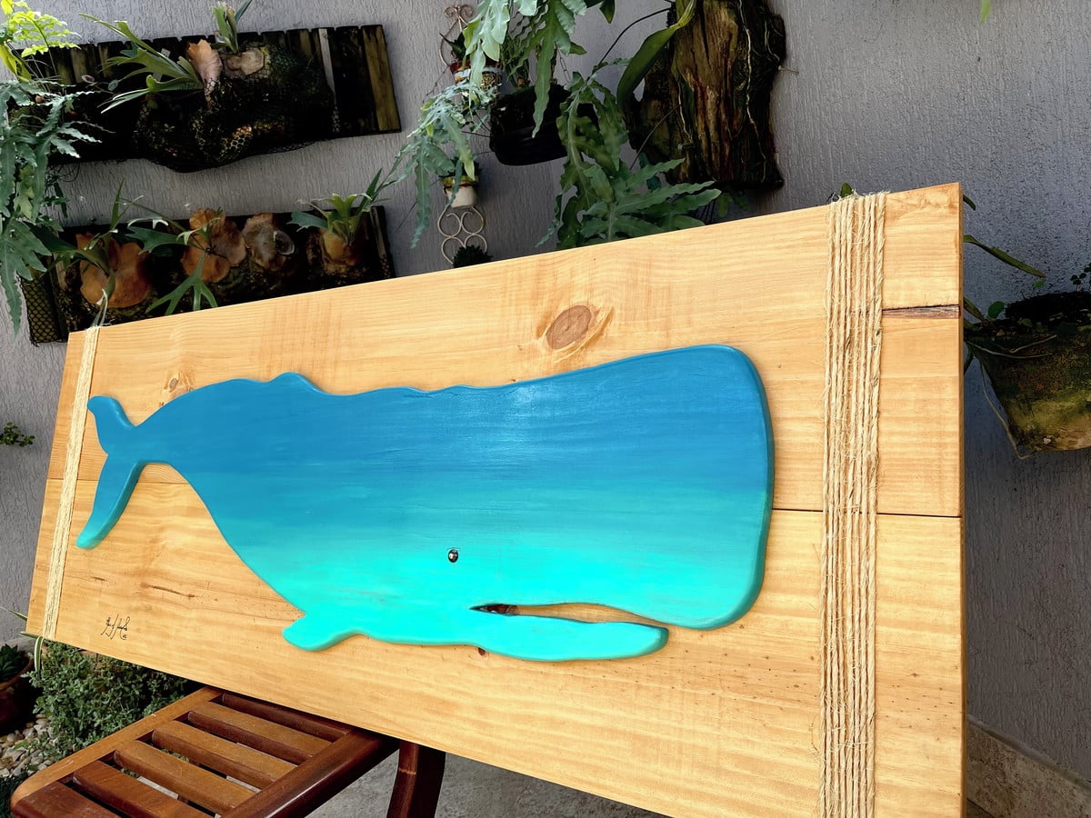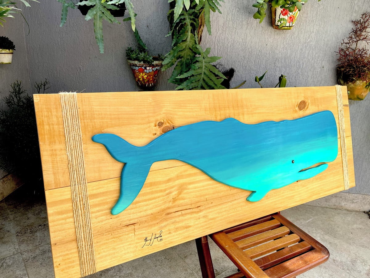 Lindo quadro em madeira com baleia recortada em madeira e pintada a mão, sobreposta ao painel de madeira medindo 1,50m, cordas nas laterais e estrela em madeira.