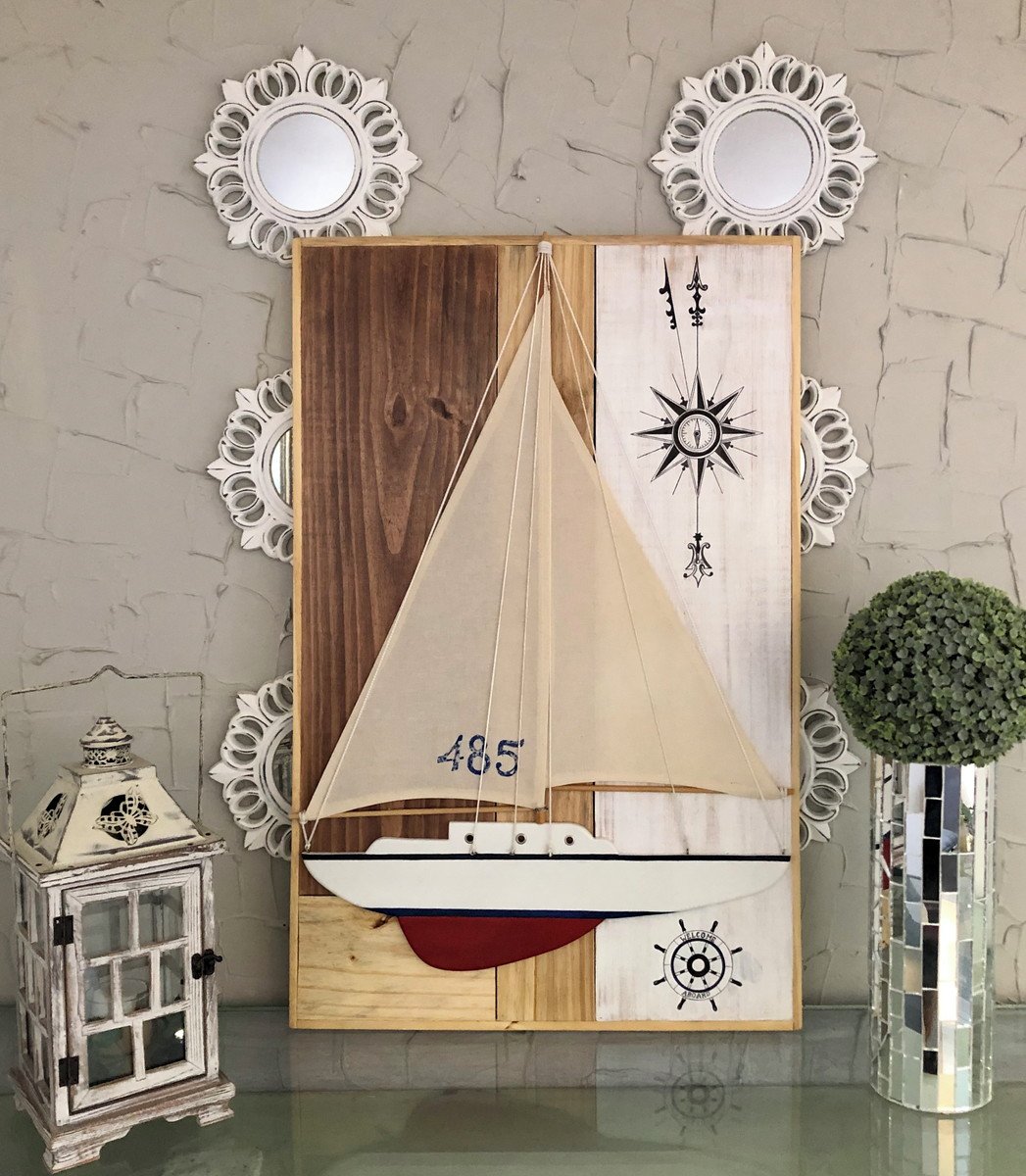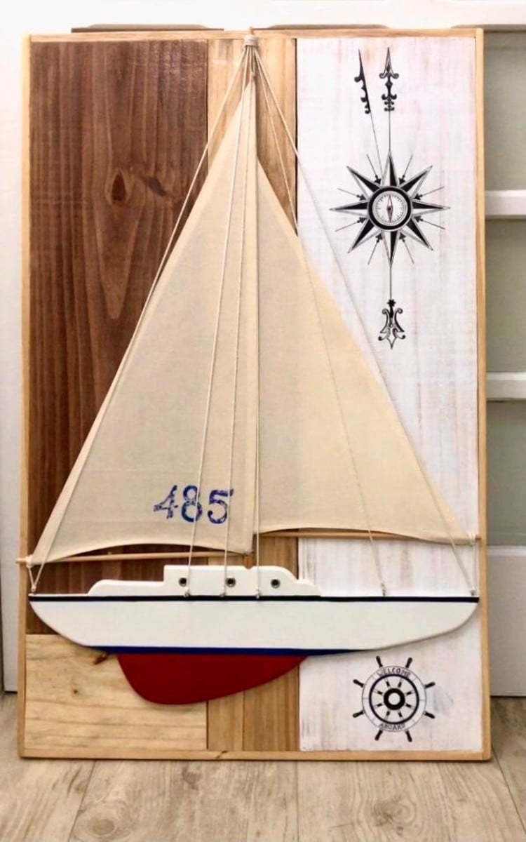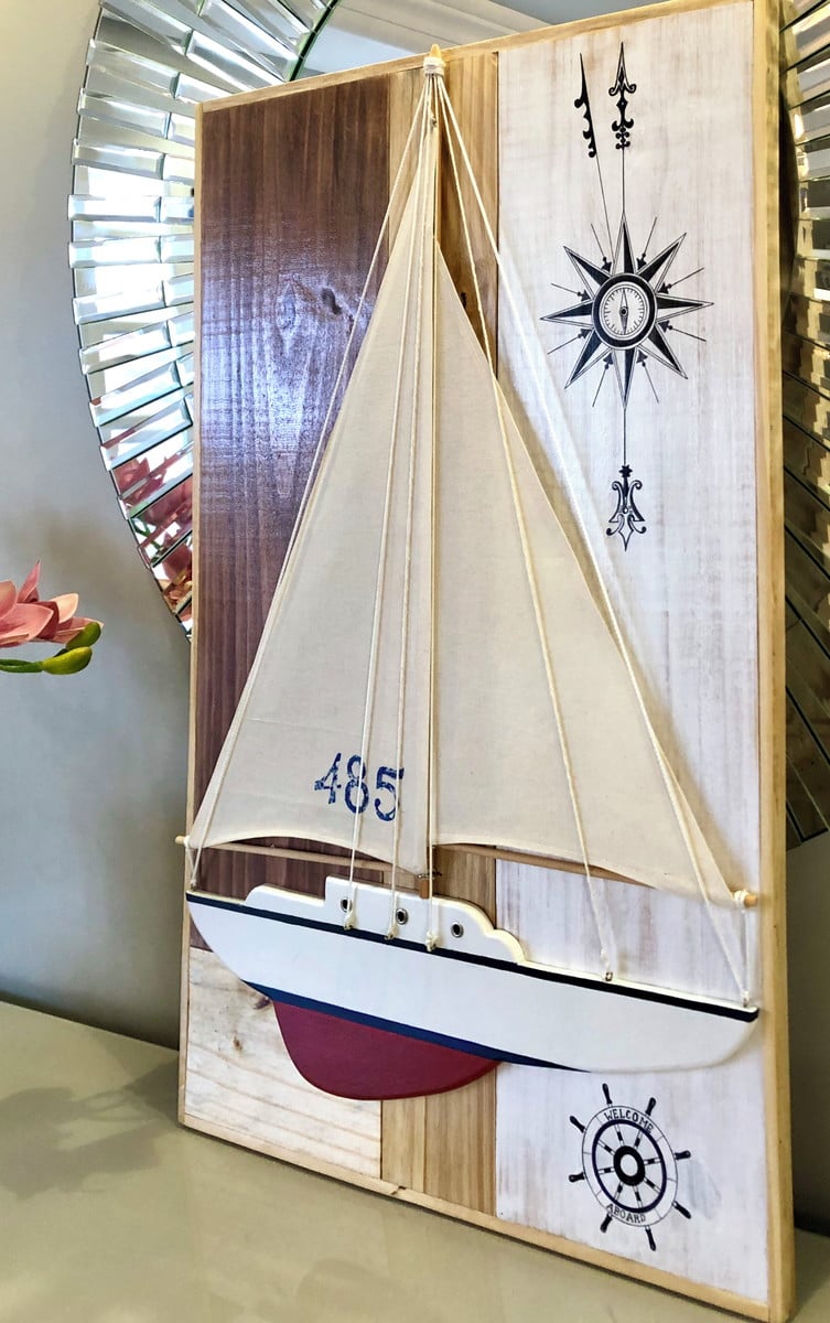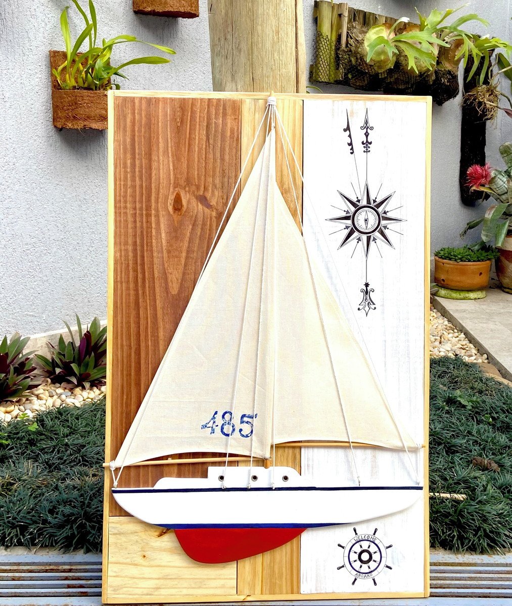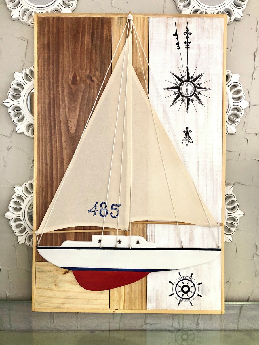 Barco feito a mão, com velas em tecido cru e muitos detalhes e acessórios q remetem a um veleiro.