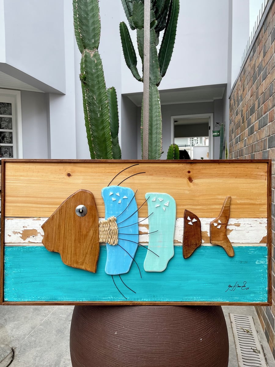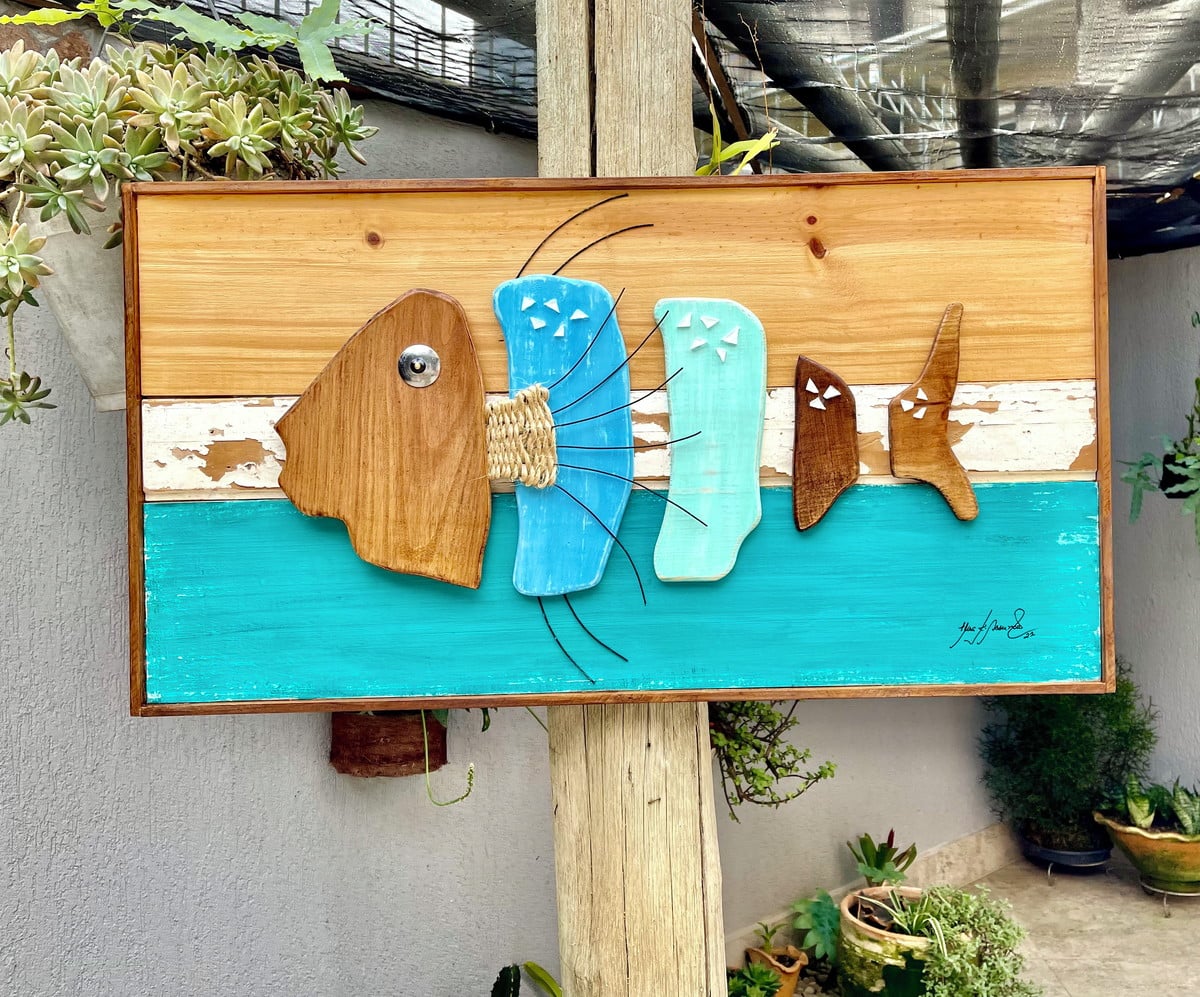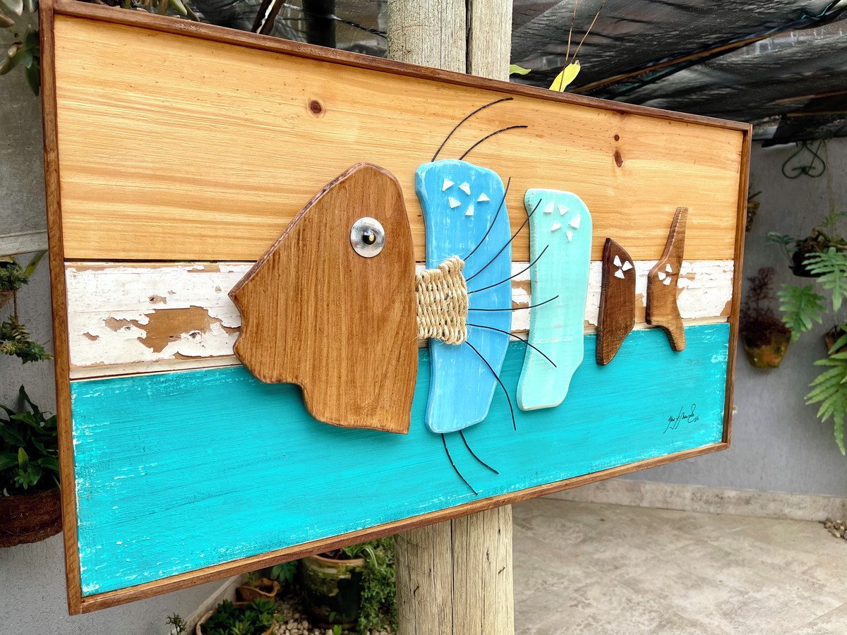 Pintura feita a mão, trabalho em corda, detalhes em arame preto, madeira natural e detalhe demoliçao.
